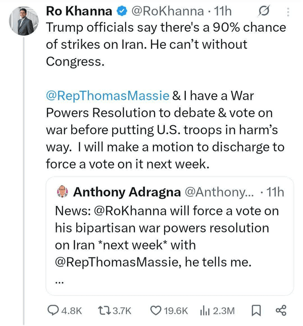 روکانا، نماینده کنگره آمریکا در پیامی در شبکه اجتماعی ایکس نوشت: «هفته آینده درباره حمله نظامی به ایران رای‌گیری می‌کنیم. ترامپ بدون رای کنگره نمی‌تواند به ایران حمله کند.»